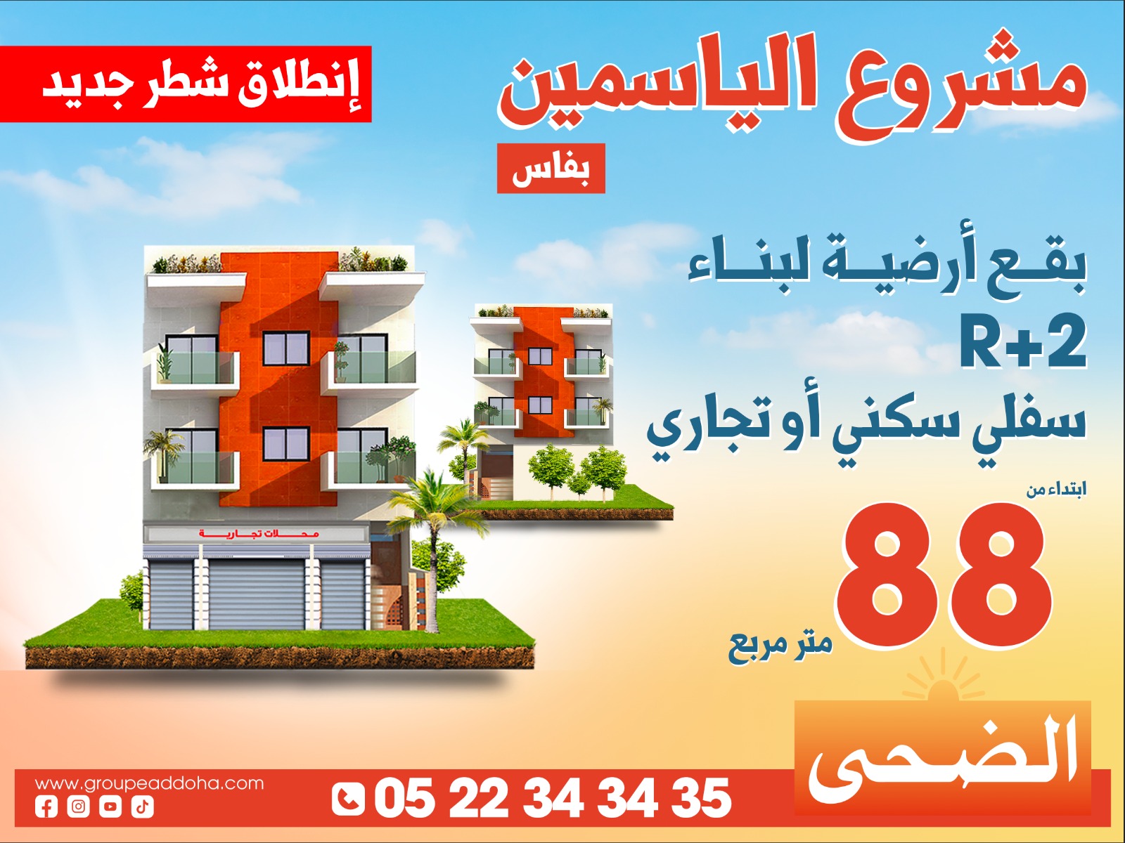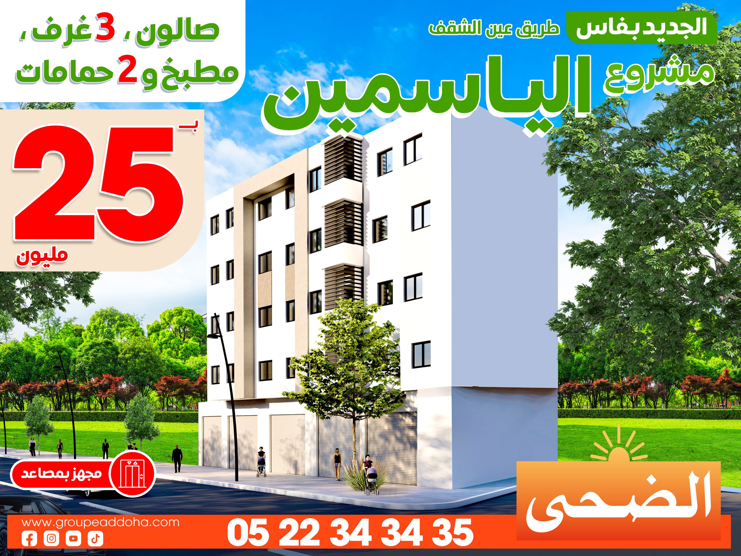 جديد الضحى بمدينة فاس: إنطلاق تسويق مشروع " الياسمين" بطريق عين الشقف بالقرب من الطريق السيار والذي يقدم لكم فرصة امتلاك شقة بتصميم عصري مكونة من: صالون، 3 غرف، مطبخ و 2 حمامات، ومصعد مميزات مشروع الياسمين : تصميم فريد: شقق بمساحات مريحة لجميع أفراد العائلة موقع استراتيجي: يتمتع المشروع بموقع متميز في مدينة فاس، بالقرب من جميع المرافق الضرورية ( مسجد ، حمام و ملاعب رياضية...) للمزيد من المعلومات، ندعوكم للإتصال بمستشارينا التجاريون
