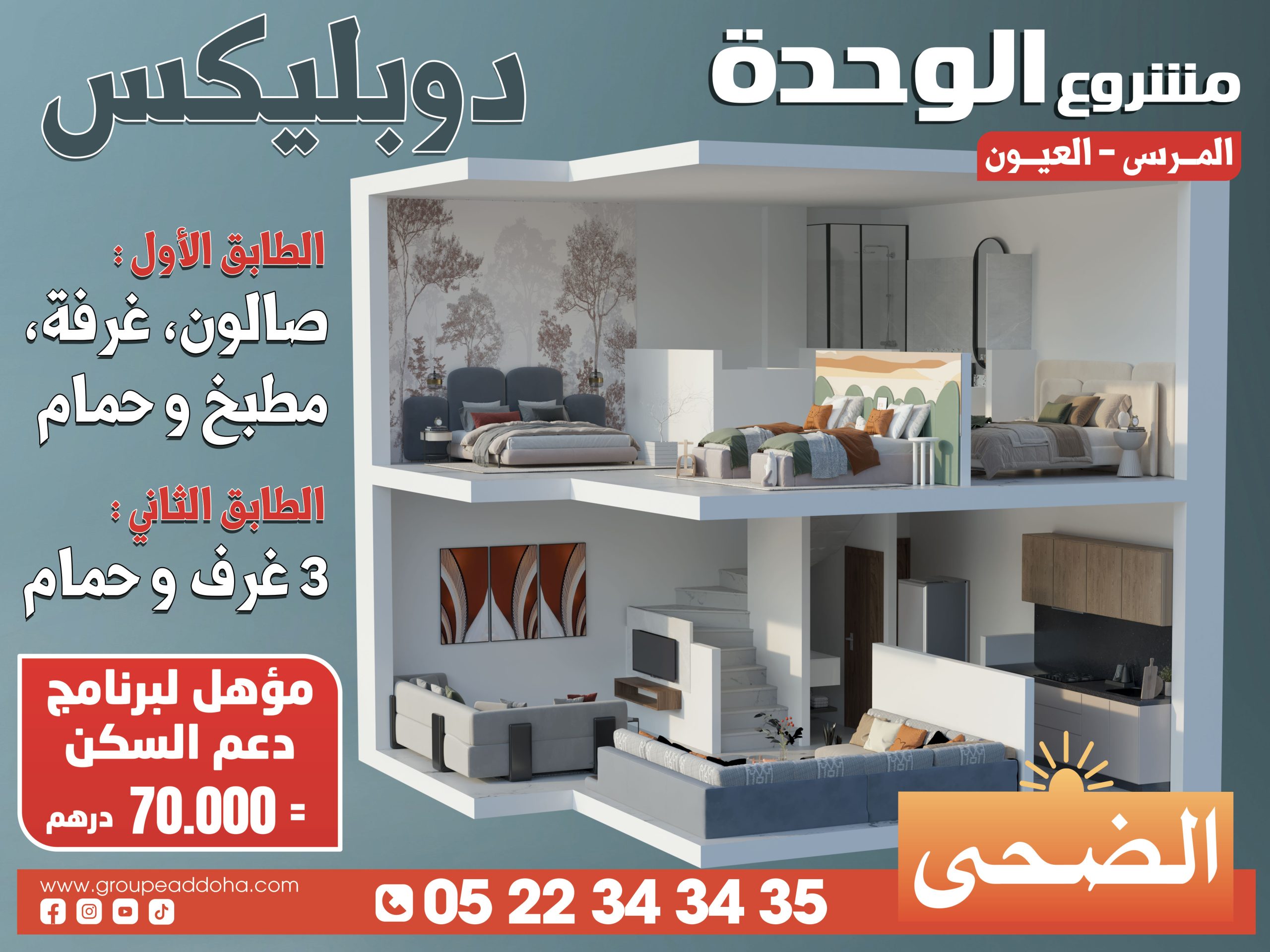 جاءت مجموعة الضحى بمشروع الوحدة بقلب المرسى العيون . يوفر المشروع شققا دوبلكس بجودة عالية ، تجهيزات راقية و مرافق عديدة و متنوعة تجعل اختياركم لمدينة المرسى العيون خيارا مثاليا